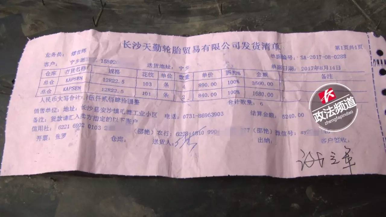 ▲据家属提供的进货单显示,发生事故的轮胎是8月14日从长沙天勤轮胎贸易有限公司进的货,而轮胎厂商为山东华盛橡胶有限公司。