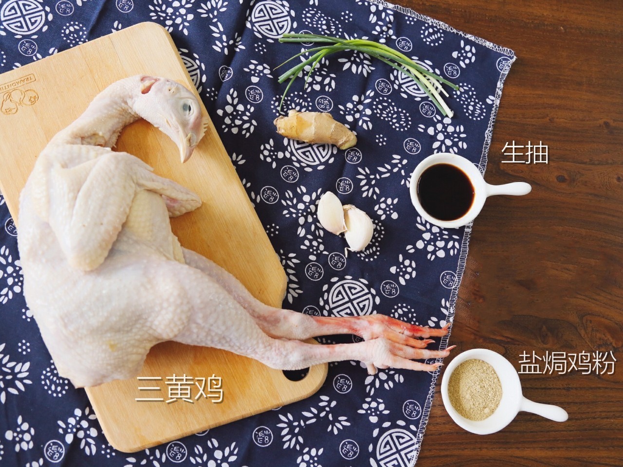 1.将三黄鸡洗净沥干,用盐焗鸡粉均匀地抹在鸡的表面和内里,在鸡肚里放几片生姜、蒜腌制1小时。