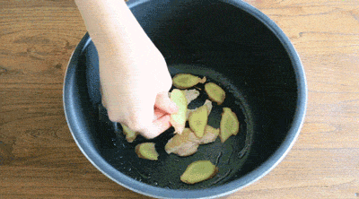 2.在电饭煲里抹一层薄薄的油,放入姜片和香葱。