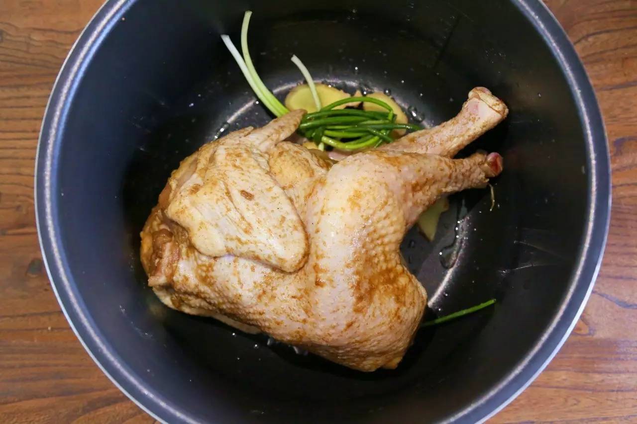 3.将腌制好的鸡放入电饭煲内,按下煮饭键。