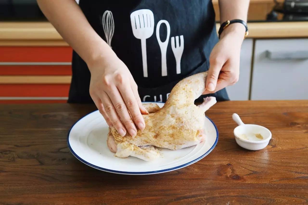 3.如果没有盐焗鸡粉怎么办?——没有的话,大家可以用盐,把鸡全身抹一遍,为了入味多按摩一会儿。