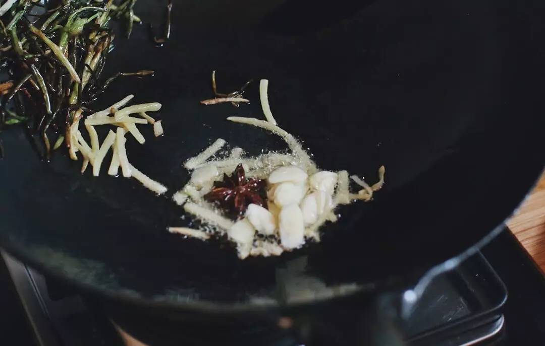 将葱拨到一边,利用葱油依次爆香姜丝、八角、蒜末。
