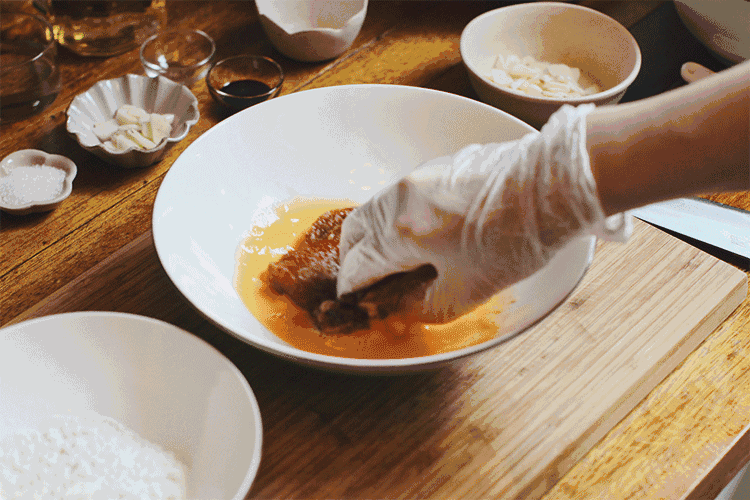 大排放在厨房纸上轻轻吸一下水份,然后放入鸡蛋液,两面充分裹上蛋液。再放入面粉中均匀裹上面粉。