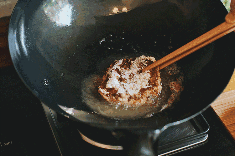 大排下油锅炸,差不多10秒左右,不需要熟,只要将面粉炸酥松,锁住水分就行。