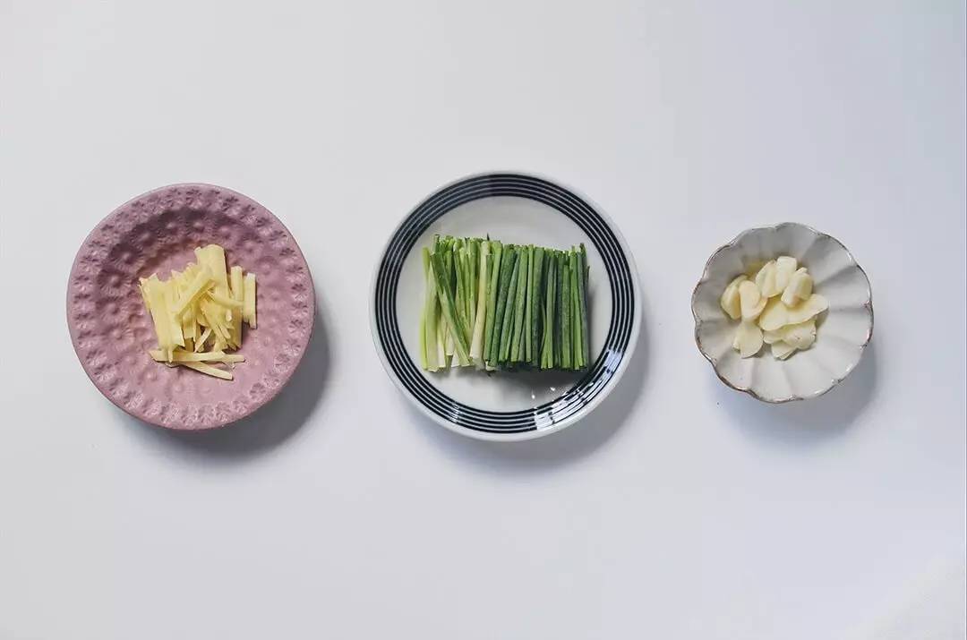 姜切丝,小葱切约5cm长的葱段,蒜拍一拍切碎。