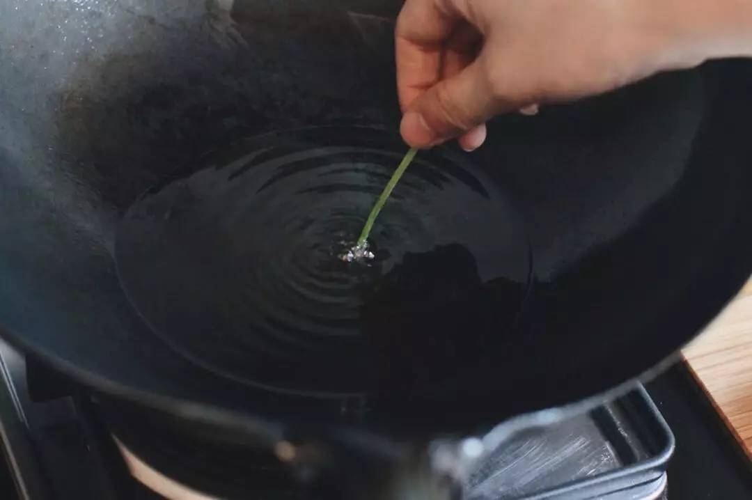 锅里放多一点油,至少要能覆盖到大排2/3的深度,用圆底的锅要比平底的更方便省油一些。小火将油烧热,可以拿根小葱试一下,像下图一样快速冒气泡的状态就表示热度够了。