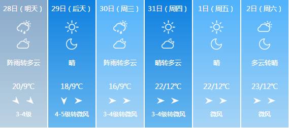 28日,市区最高温20℃,最低温降至9℃,雷阵雨转多云。