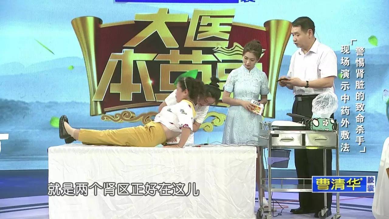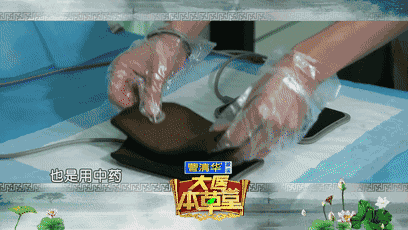 药包浸醋,加热蒸熟蒸透,将它平铺在电极板底下,患者平躺,将两个肾区放在上面,通过加热,直接将中药大分子通过皮肤导入肾区。
