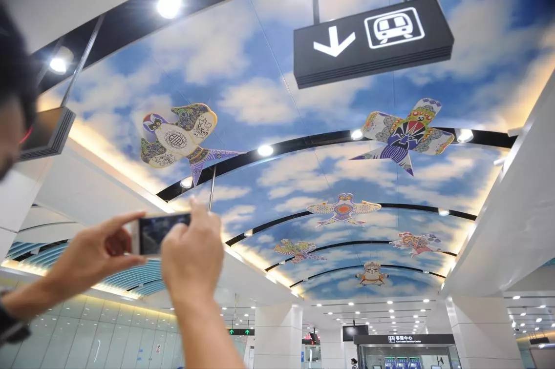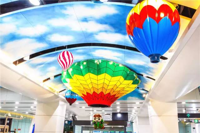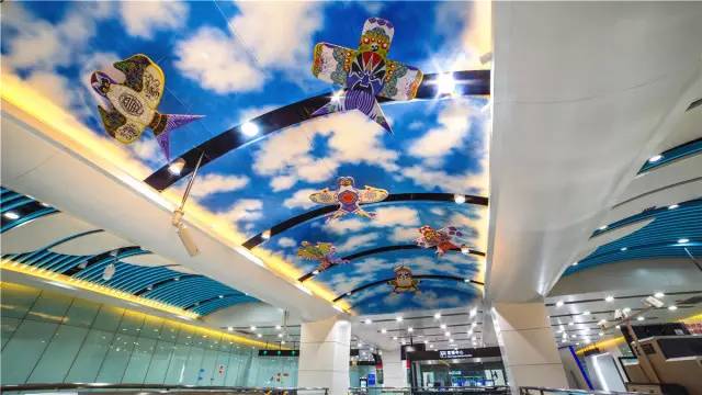不仅有西洋童话元素,1航站楼站也有中国传统元素哦!蓝色的天花板上有传统风筝的元素。