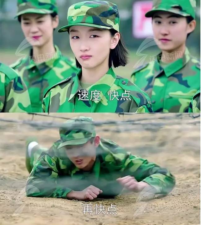 在剧中,秋水叫肖红灾星,她就故意找麻烦,折腾得秋水一次一次钻铁网训练。听,教练在喊“速度快点、再快点”。