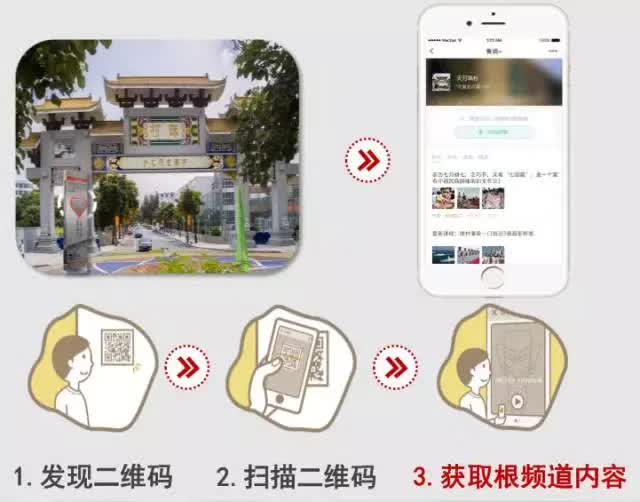 在珠村小学、北帝庙、榕树头、珠村牌坊等地的显眼位置,你都能发现地图二维码,只要你打开手机扫一扫二维码,就可以精确的感知乞巧文化。