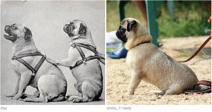 但是其实,100 年前的狗子并不是这样的,但是欧洲人喜欢小短腿,所以用法国斗牛犬和其他品种的狗杂交,经过了长时间一代代的培育,狗子们腿更短了,脸更扁了,身材更圆滚滚了。