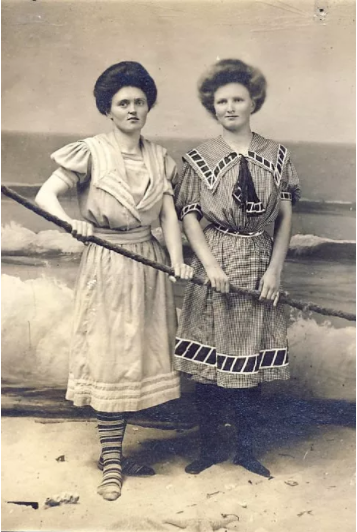 没错,这真的是泳衣不是水手服。100 年前,女性要穿有袖的羊毛裙子、衬裤和长筒袜游泳。