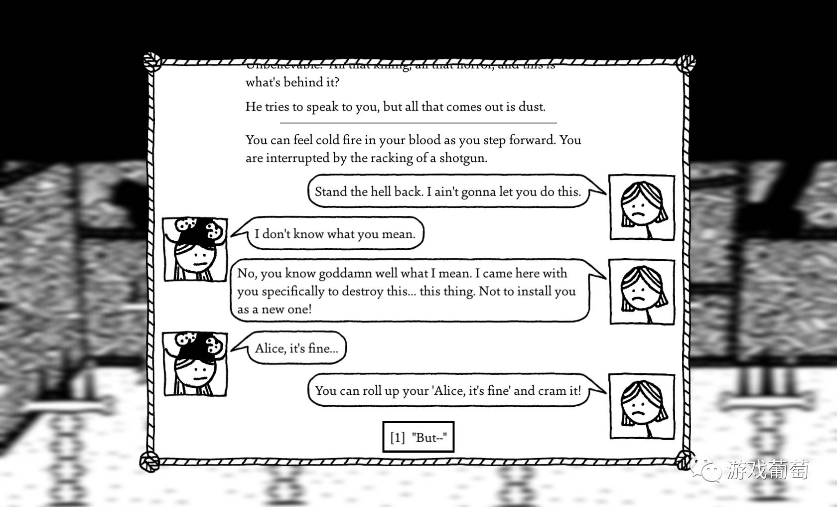 当你醉心于权力的幻想之中时,Alice朝天一枪将你惊醒,她向你大喊:“给我回来,我不允许你这么做。”你尝试装傻,装作不懂她的意思。愤怒的Alice尖声戳破了你的谎言:“你他妈当然懂我的意思。我和你来这是为了摧毁这些东西,而不是让你成为他们新的一份子!”你尝试着安抚她,然而她已经完全失去了对你的信任,并将枪口对准了你。