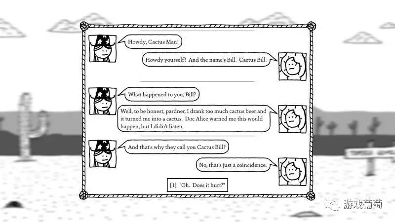 《憎恶之西》的整体基调轻松诙谐,这一点也会体现在许多与NPC的对话当中。葡萄君在镇子上遇到了一个变成仙人掌的陌生人,于是我们发生了以下对话: