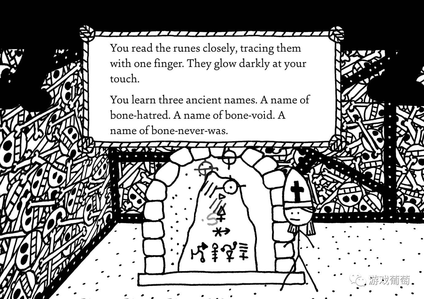 “你靠得更近以阅读符文,用一根手指描摹着他们。在你的触碰下,符文发出暗光。你认识了三个古老的名字。他们分别属于憎恶之骨,虚无之骨,从未存在之骨。”