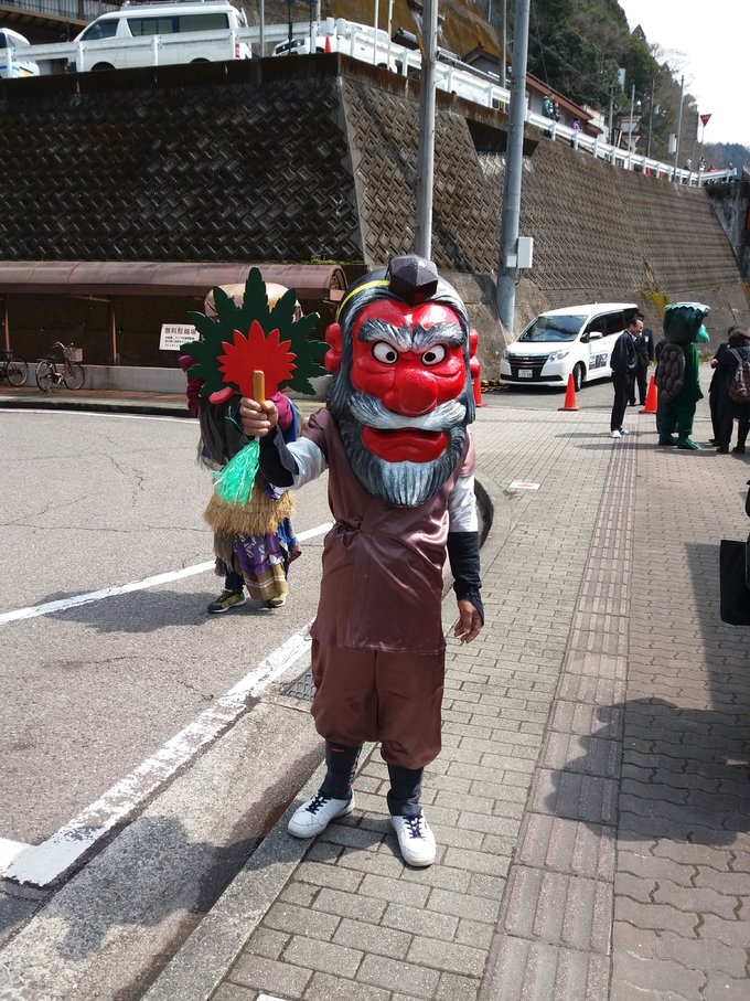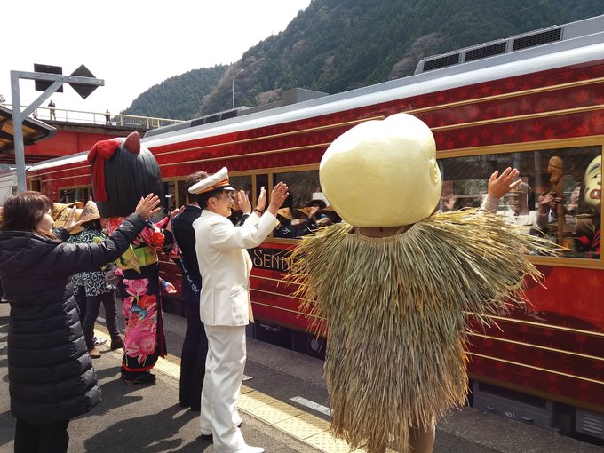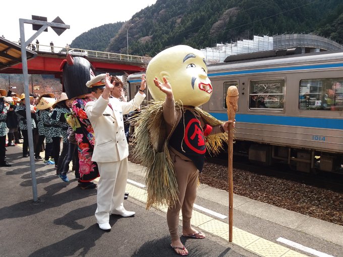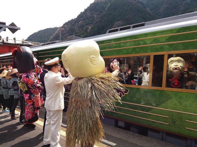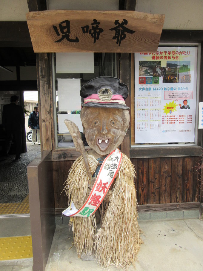 大步危小步危算是祖谷景区的门户,祖谷是日本三大秘境之一(另两处为岐阜县白川乡和宫崎县椎叶村),这里除了自然风光还有一大特色。古时祖谷人迹罕至,险要的地势和陌生的自然环境足以令人充满敬畏,自古便流传着有妖怪出没的传说,如今妖怪文化已是这片景区的又一标签。游客在大步危车站一下车就可以领略到鲜明的妖怪风情,在大步危还有类似资料馆的妖怪屋敷,我没有去妖怪屋敷参观的余暇,但妖怪真出来了想躲也躲不过。且说我刚到大步危车站的时候狭窄的站台已经布置出一个会场,大概是有什么活动,从大步危峡散步归来在车站附近一家小店吃面时也见店里很多人在忙着准备什么,饭后出了小店已经看到好几个穿着妖怪服装的人在车站前出没,还有些拿着法螺贝(一种用大海螺做的传统号角)的人,走进车站发现站台上也列队站了很多人,打扮成妖怪的、穿制服的、穿传统风格服装拿着法螺贝的。过一会儿一辆列车驶来,拿法螺贝的人们一个劲儿的吹,其余人和妖怪都在举着双手欢迎,场面特别隆重,我要乘坐的列车此时从站台另一侧的轨道驶来,那些欢迎的人群里一些人转身也冲着这趟车挥手。他们究竟在庆祝什么,当时我猜测最先驶来那趟列车是新开通的线路,后来在网上一查果然如此,列车名为“四国正中千年物语”,是一趟往返于香川县多度津和德岛县大步危的高端观光列车,我这短暂的大步危之行还真是幸运,赶上的不仅是节日般的庆典,更是大步危旅游业的一个历史时刻,想到那四国正中千年物语首班列车的车窗上曾映照出自己的影子,心里便洋溢着满满的幸福。