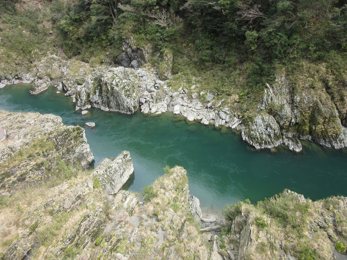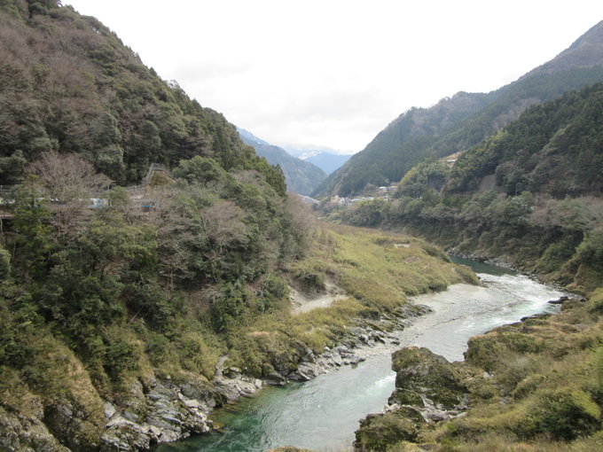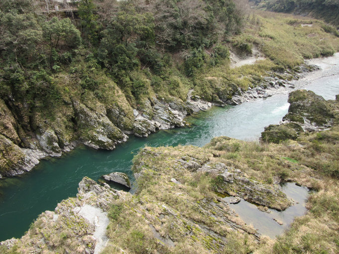 计划当天进入高知县,从南小松岛继续向南的铁路终归是条死胡同,我需要返回德岛利用另一条铁路线先向西再南下,这条路沿途经过位于德岛县三好市的日本著名名胜大步危小步危,我这完全按照个人喜好以史迹巡礼为主题的行程不能给自然风光安排太多时间,只是在大步危走马观花一番。之前曾同样浅尝辄止游走过新潟县名胜亲不知,大步危小步危和亲不知子不知的得名方式类似,也是因为地势险要,大步危就是走大步很危险,小步危则是走小步很危险。大步危小步危是一条狭长的溪谷,我从大步危车站乘巴士来到大步危峡,之后徒步原路返回,仅仅是沿着溪谷简单散步,无暇继续深入景区。漫步在青山碧水景色宜人的大步危溪谷,内心颇为矛盾,难得来此一游,散个步就走着实暴殄天物。毕竟初来乍到,想去的地方太多,倘若以后有机会再来四国得尽可能在这边多安排些时间。此处名胜很受海外游客青睐,从大步危车站下车时除了我还有很多外国人,在车站外地图说明板前几个大胡子老外问我从车站走到祖谷蔓桥要多长时间,我拿电子地图查了一下告诉他们20分钟就好,当时心里还在嘀咕怎么这么近,但手机这么显示的也就觉得理所当然,我还对照地图给他们指路,这几个外国人按我说的溜达着去了祖谷蔓桥。后来我突然发现自己的电子地图开的是驾驶模式,之前那20分钟其实是行车时间,这可把那些外国人坑惨了,弄得我心里很过意不去,幸亏当天正好是4月1日,就当给几位西方朋友过节了。