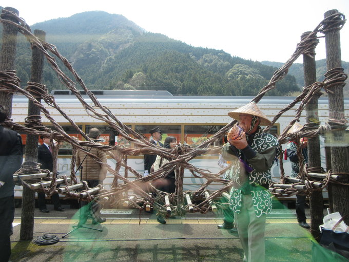 我在前往高知县的列车里,窗外正好对着站内的微缩祖谷蔓桥,还有新开线路列车和欢迎的人们,一期一会