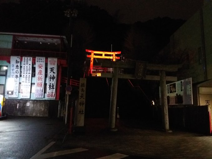 夜晚德岛天神社被灯光照亮的鸟居格外显眼