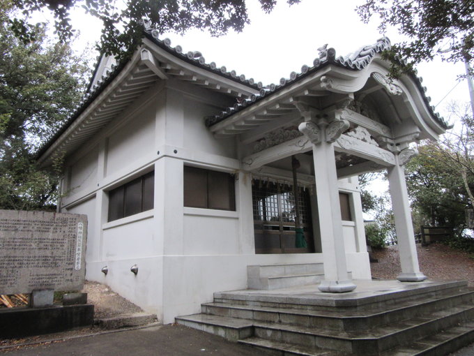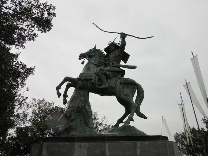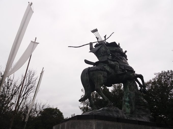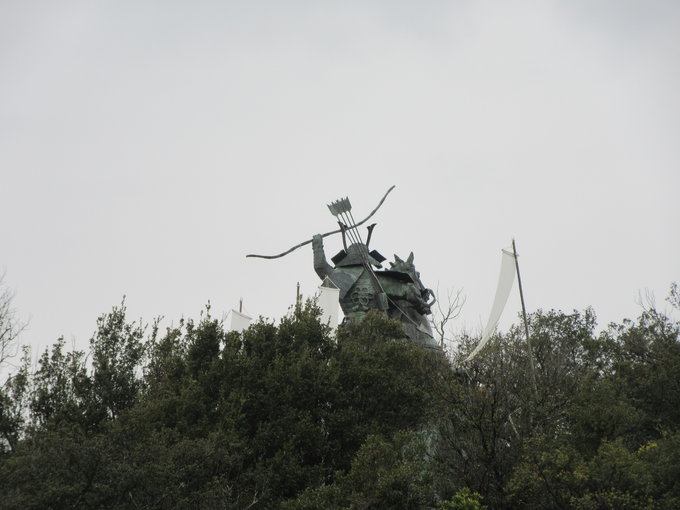 到达旗山,虽然名字是山,实际没有多高,登顶没费多大力气。山顶那尊巨大的源义经骑马像相当威严,骏马双蹄立起,义经振臂举弓,仿佛在高呼着鼓舞士气的口号,相当振奋人心,我特意选在这里开始自己的四国之旅果然没错。通过说明了解到这尊铜像是日本所有武将骑马像里最大的,而义经胯下这匹骏马就是他的爱马“大夫黑”。在骑马像旁插着些许条形白布旗,旗山怎能少了这些,山顶的整个画面仿佛把义经登陆四国插旗明志的历史情景活灵活现展现在我的面前,哪怕天气是蒙蒙细雨,内心却燃烧着激昂的热情。在山顶除了义经像还有供奉着源氏守护神的八幡神社,下山后我按照先前司机师傅的介绍在旗山附近找到一处名为“弁庆岩屋”的史迹,虽然名字取自义经著名家臣武藏坊弁庆(1155-1189),实际是一处古坟时代(250-593)的古坟石室,只是因为此地和义经息息相关才用义经家臣之名来命名,并不是义经时代的史迹。离开旗山前查了下列车时刻,从这里走回车站倒也来得及,便按照电子地图疾步返程,走出旗山不远又回头相望,可以清楚的看到山顶义经骑马像的背影,稍事停下脚步行注目礼,之后再迈开紧张的步伐。回到车站,看到车站外停着的唯一一辆出租车,还在猜测是不是刚才那位老师傅时已经透过车窗看到老师傅那露出整齐而洁白牙齿的笑脸,我们笑着互相点头致意,这趟小松岛义经之旅我并不孤独。