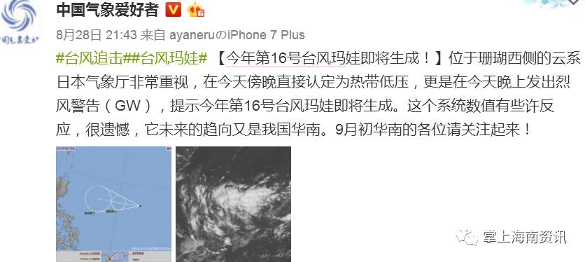 8月28日晚上,美国联合预警中心突然升格其为热带扰动;与此同时,日本气象厅更加激进:升格其为热带低压,认为其中心附近最大风力已有7级,并有可能加强为今年第16号台风玛娃。