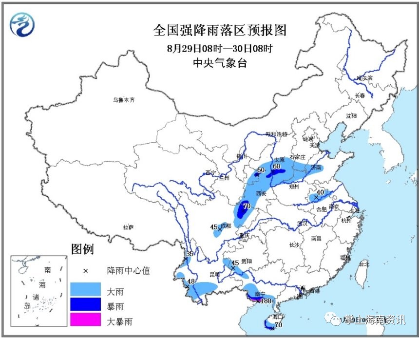 据@中国天气网 预计8月29日08时至30日08时,雷州半岛西部、广西南部和西部、海南岛西部和南部、云南南部和西部、贵州西南部、四川盆地西部和中北部等地的部分地区有大雨或暴雨,其中广西南部沿海局地有大暴雨(100~180毫米),上述部分地区有短时强降水,最大小时雨强50~80毫米。