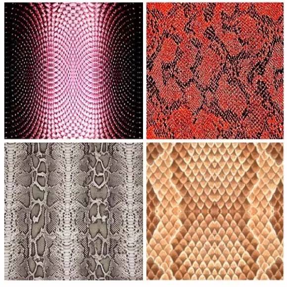 图2 爬⾏动物⾝上、蛇鳞中出现的重复图案和闪烁光幻视中看到的⽹状物、斑点、柱状物、三叶草图案有异曲同⼯之处。