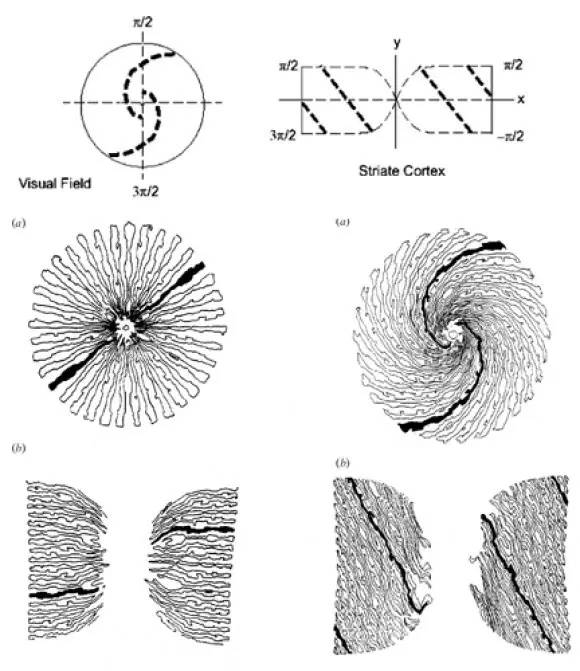 有证据显⽰,光幻视的形状指数与视⽹膜细胞盘状结构、视觉⽪层⽹格/柱状神经结构间的空间关系直接相关。视⽹膜-视⽪层信号的耦合通路被激活、丧失稳定性,⾃发产⽣⼏何幻觉。从浑然⼀体的视觉混叠到⾃然⽽⽣的⼏何图案的转变可以说是⼀种跨临界或叉型分岔,在这种转变中被激活的是反映周期性⽹状图案空间结构的视觉区域。