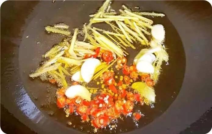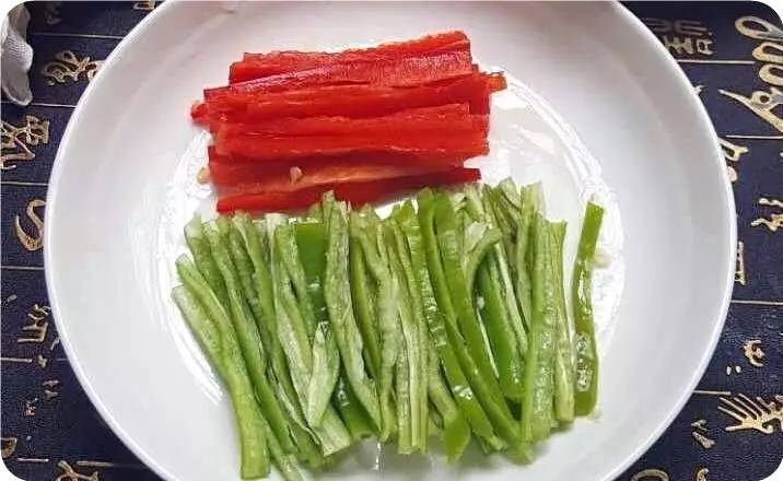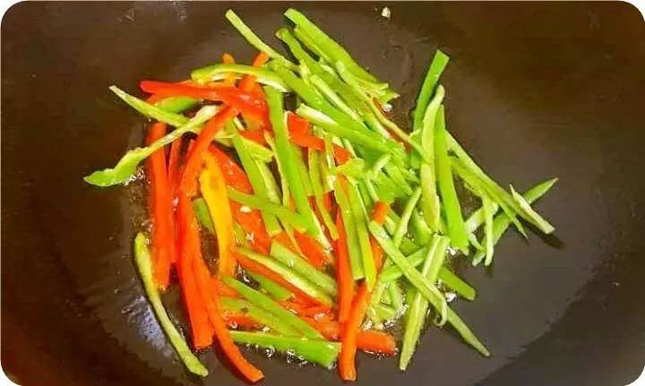 11、20分钟后,锅中热油,先下青辣椒,红椒丝下锅翻炒变颜色,捞出来放碗中备用