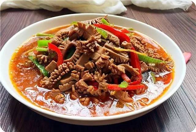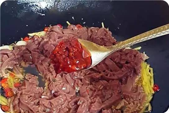 13、下腰花来半勺豆瓣酱一起翻炒,动作一定要快