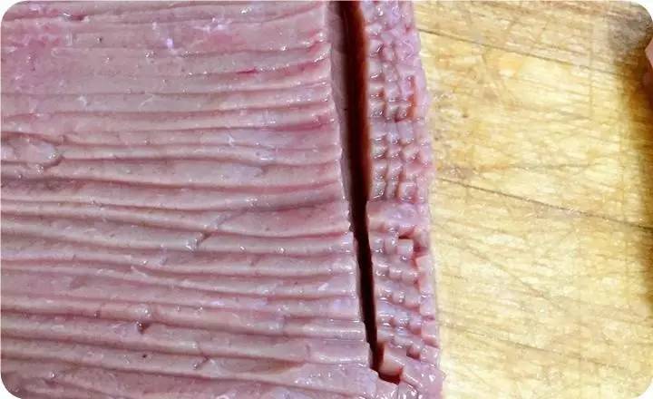 4、再竖向切细片,刀法同上,每切3~4刀切断(做为一小块)