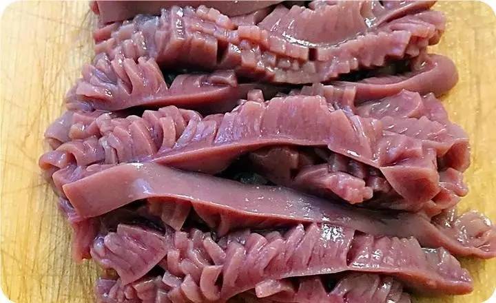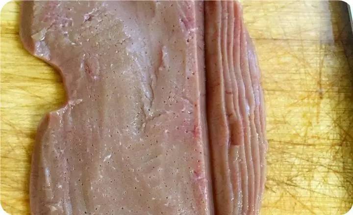 2、腰花对半切开,去除内部比较红的一层和白膜