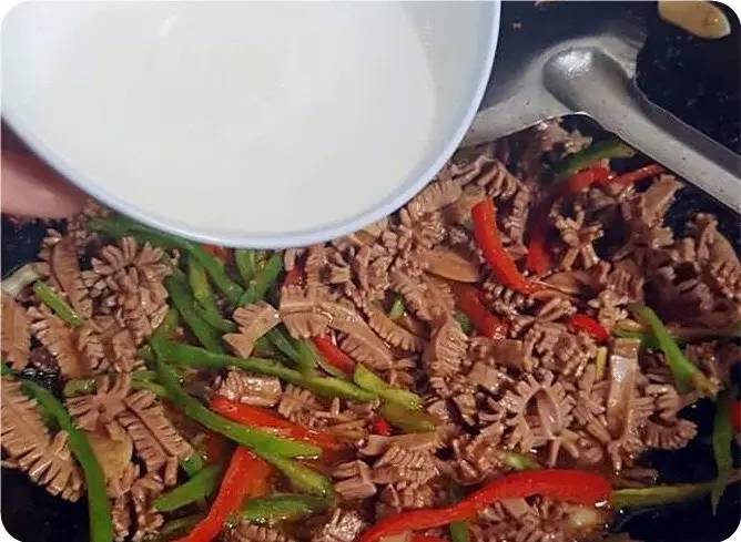15、放入刚才翻炒过的辣椒丝,加入勾兑好的红薯粉,快速翻炒均匀即可起锅。全程大概3分钟