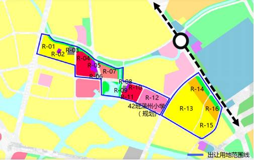 ▲规划用途(亮黄色为住宅用地,暗黄色为商住混合用地,红色为商业设施用地,紫色为社会福利用地,粉色为科教文卫用地,R-08为交通枢纽用地,R-09为轨道交通用地)