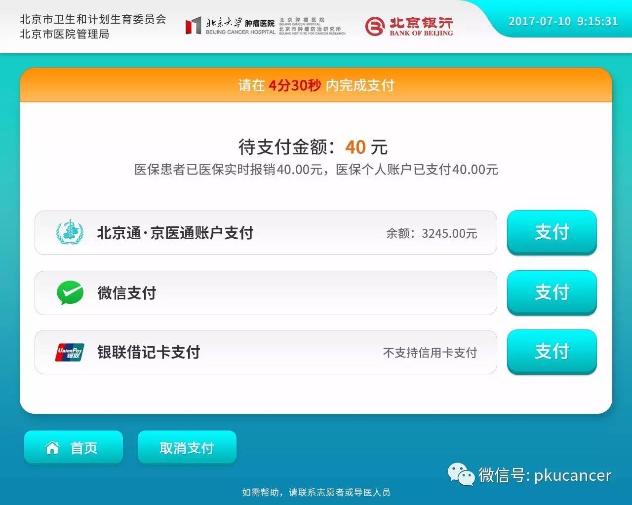 第三步:支付界面选择支付方式,目前京医通自助机缴费支持三种支付方式,京医通余额、微信支付、银行卡(储值卡)支付。