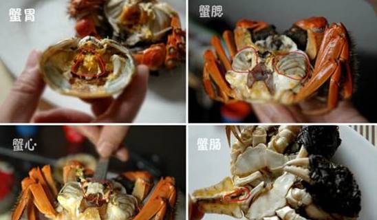 蟹心:藏在蟹腹中间黄膏最厚的地方,是最寒的,一定不能吃。掀开蟹壳,可以看到一层黑色的膜衣,白色片装的蟹心就在黄膏与黑色膜衣之间。