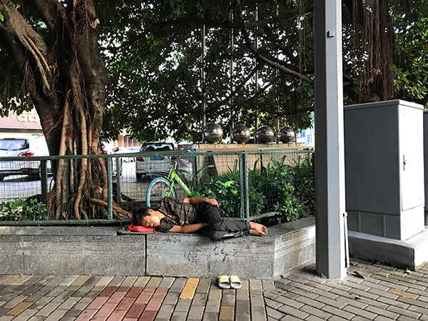 早上六点,他在十字路口的大树下蜷缩着睡着了。太阳升起后,这里变得热闹起来,上班族匆匆赶着路,两个短发女人从树下走过时,捂着鼻子说:“那个人好臭!”