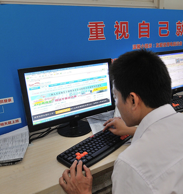 2014年10月14日,广东深圳,龙华三和人才招聘市场为应聘者提供网络应聘服务。视觉中国 资料图