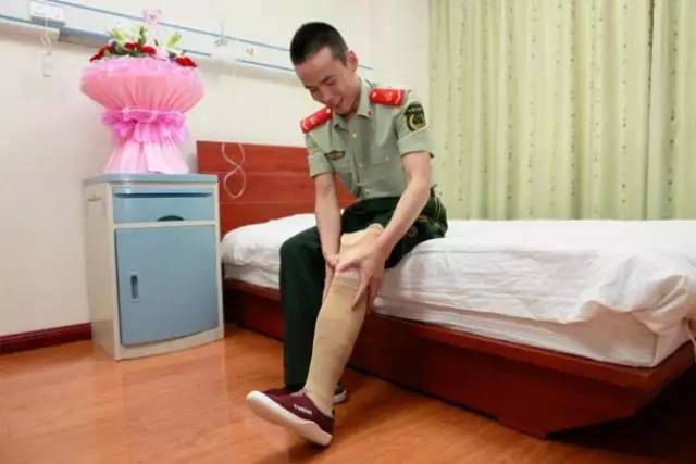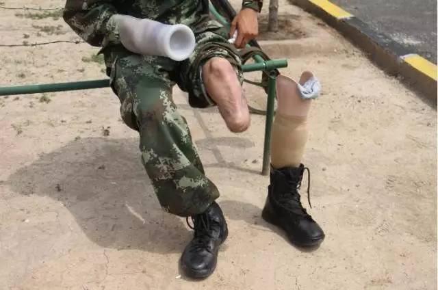 失去一条小腿,穿上假肢,重新站立;从依靠双拐走一圈、两圈,到丢掉双拐试着走一步、两步...一次次跌倒又爬起来,左腿与假肢连接处被磨得血肉模糊,腿肿得连裤子也穿不上,他全然不顾这些疼痛,依然坚持练习。安上假肢的当天,他就能在医院的院子里连走3圈;仅一个多月后,就重回部队参加训练。