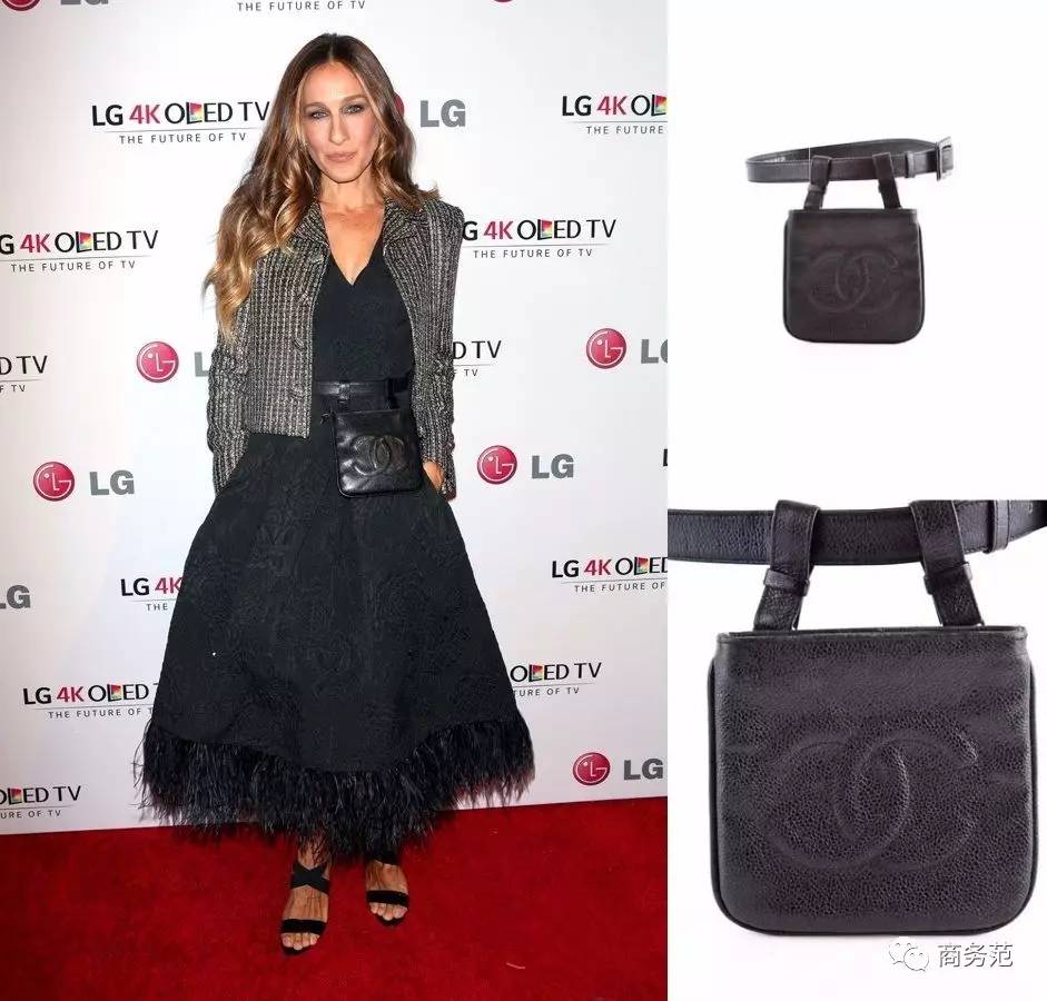 《欲望都市》中Carrie Bradshaw饰演的女主性感优雅,曾用短款塑身上衣搭配条纹半身裙,腰上佩戴GUCCI腰包( classics fanny pack) ,经典造型一下让好多人知道腰包也可以不那么Low~