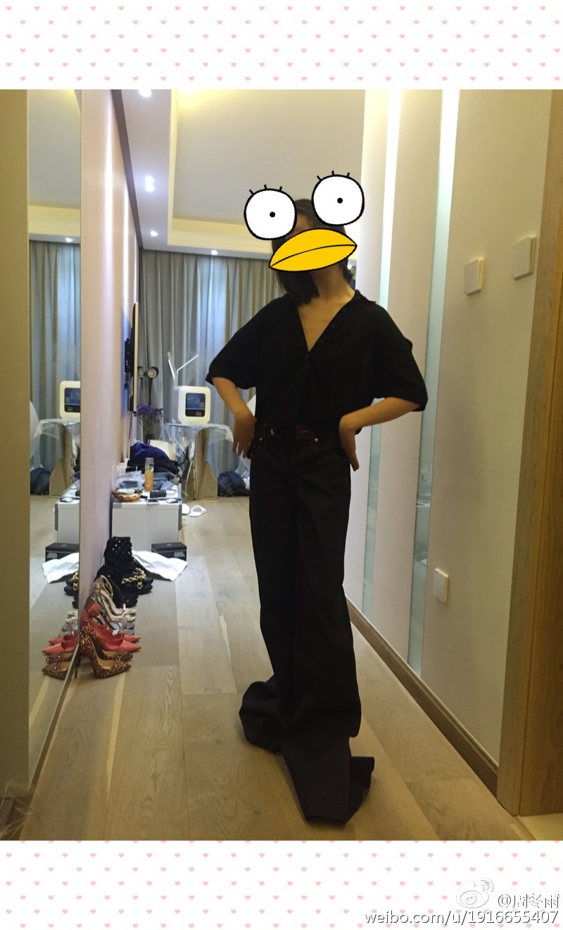 这张就清晰了,郑爽一遍看出,一只手拿着手机,然后还要牵着裤子。很明显,是因为今天穿的这条裤子太!长!了!