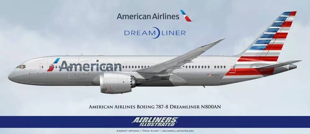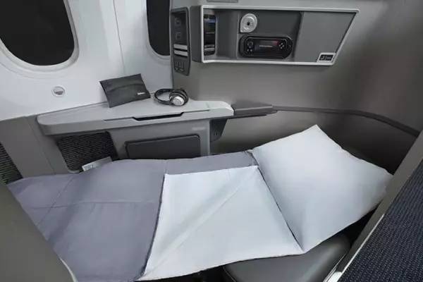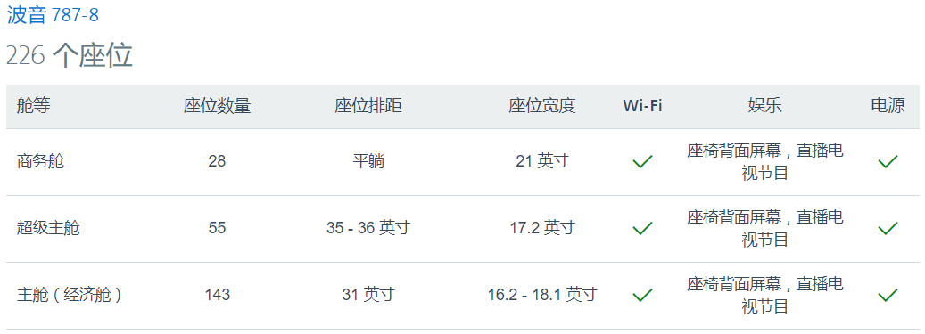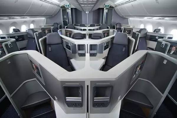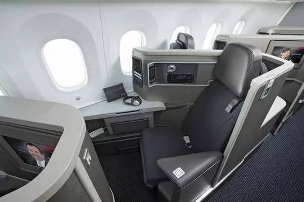 美国航空梦幻客机787-8一共有226个座位。分为商务舱28个、超级经济舱(Main Cabin Extra)55个和经济舱143个,商务舱按照1-2-1布局,采用77英寸全平躺座椅。而经济舱座位全部配有电源和USB插口,机上娱乐系配备为15.4英寸的HD触摸显示器,据说还有Bose降噪耳机,这配置妥妥的高大上啊!