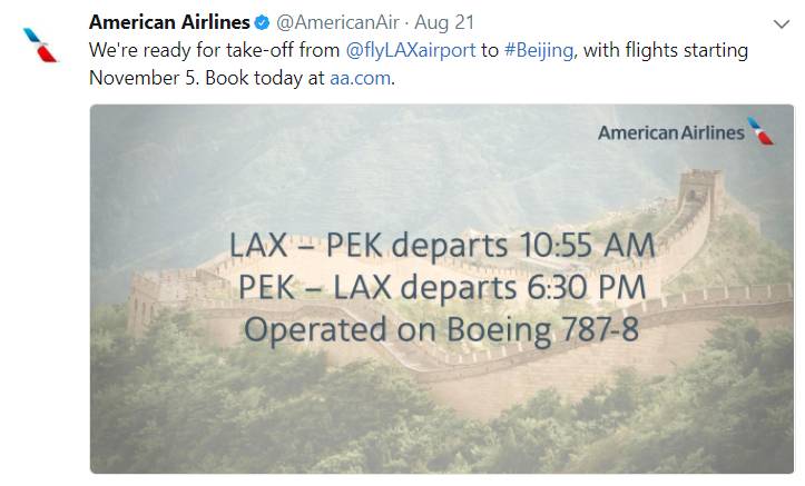 目前,从北京直飞洛杉矶的航线只有中国航空(Air China)一家,乘搭达美航空(Delta Airline需要在西雅图或是底特律中转,而联合航空也只有往返旧金山的直飞航线。现在美国航空的新航线出现,又给了我们一个新的选择!