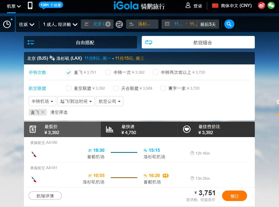 也许你看到这儿,就很想知道机票价格,迫不及待要去美国航空官网查机票了吧?!先别着急去官网买啊,iGola上可以搜到比官网足足便宜700大元人民币的优惠价呢!不信?有图有真相啊!