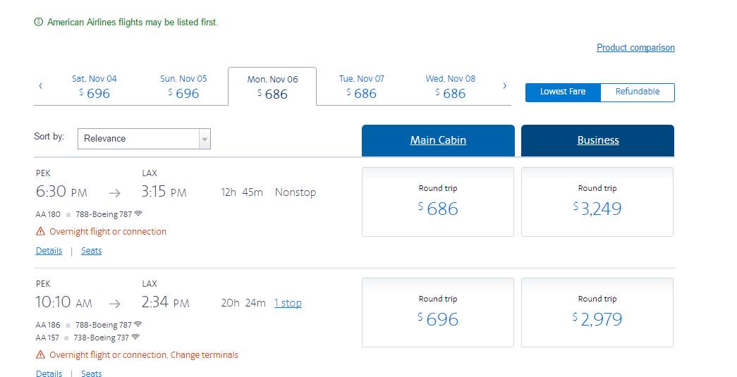 随机挑选了一个日期,就以11月6日出发-11月15日回程为例,美国航空官网的报价为含税往返$686美金,折合人民约4527元。
