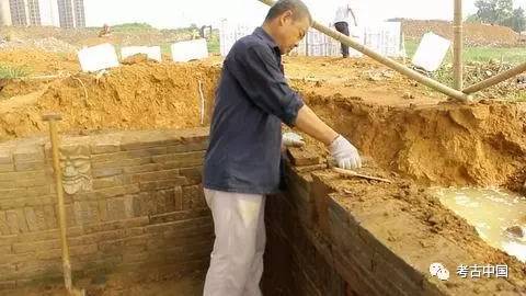 为保持墓砖的完整性及方便拆卸墓砖,每当拆除到一定高度时,使用人工将墓框四周挖宽,然后拆除完整暴露出来的墓砖,此项工作反复进行。