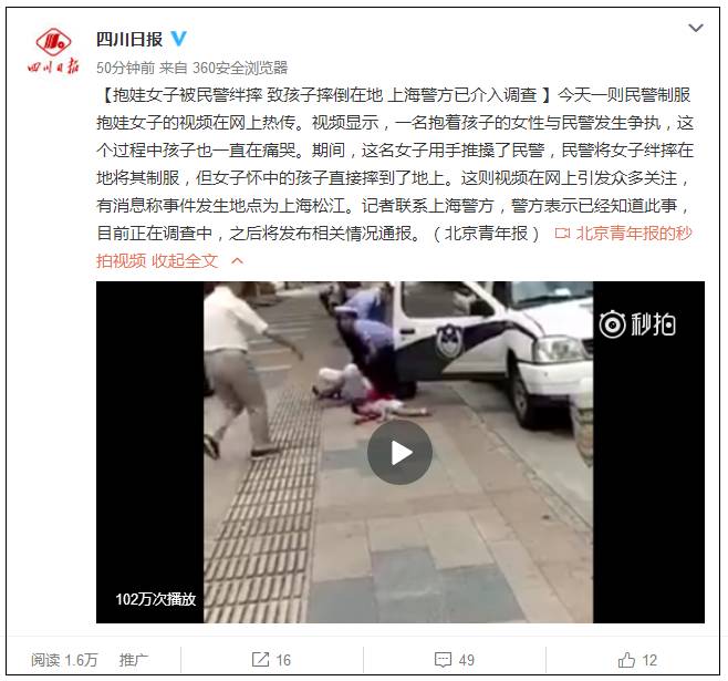 松江分局宣传科袁警官对此向记者证实,视频发生事件发生在9月1日上午10点,事发地点位于上海松江九亭。被摔孩子没有什么大碍。