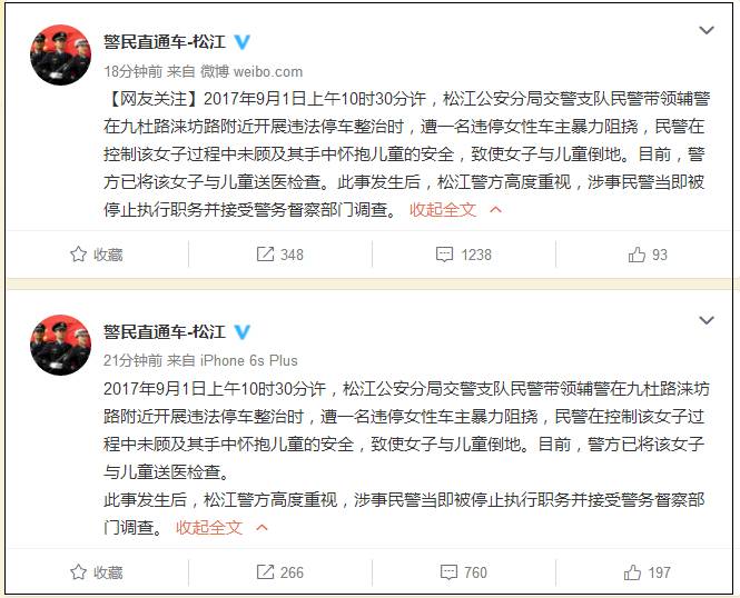 9月1日上午10时30分许,松江公安分局交警支队民警带领辅警在九杜路涞坊路附近开展违法停车整治时,遭一名违停女性车主暴力阻挠,民警在控制该女子过程中未顾及其手中怀抱儿童的安全,致使女子与儿童倒地。