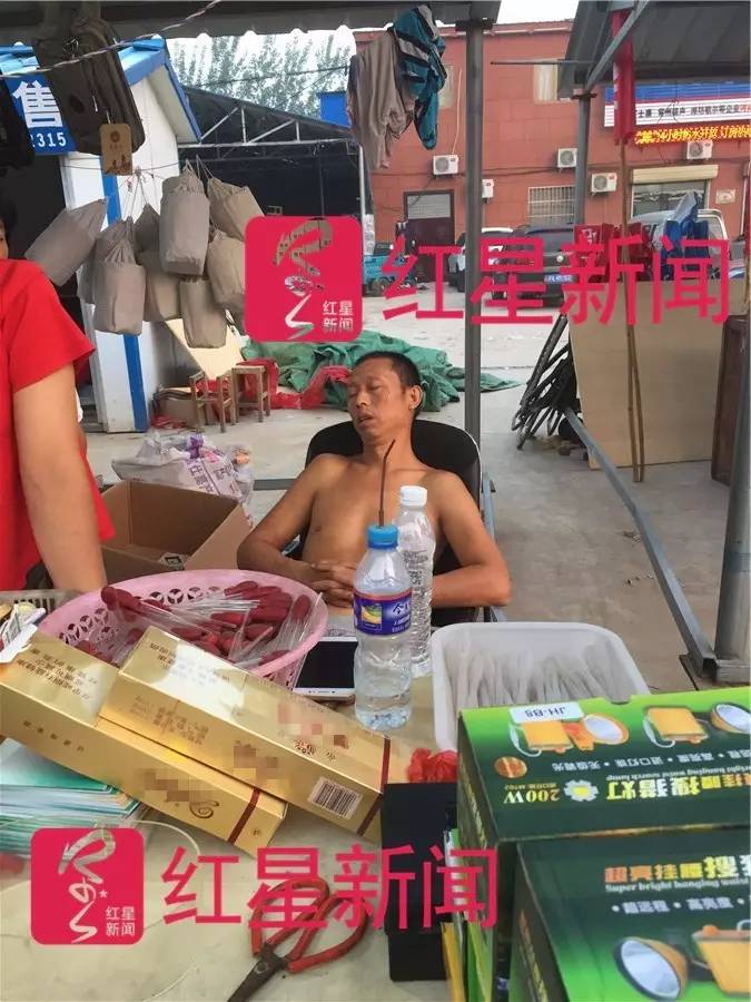 ▲忙碌一夜的董瑞印坐在自己售卖蟋蟀用品的摊位前,睡着了。